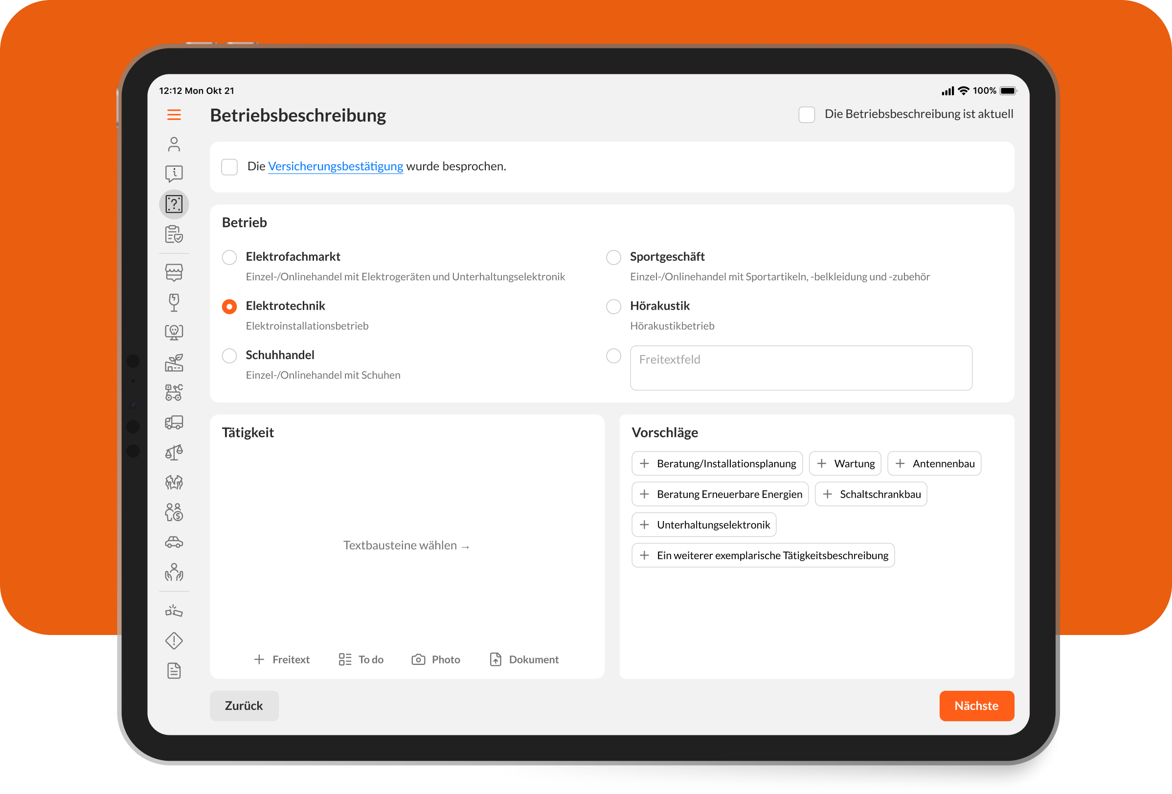 Unser Produkt Digitales Jahresgespräch wurde auf den Beratungsprozess des expert Versicherungs-Service angepasst - das Risikogespräch wird über das iPad beim Kunden geführt. Mit der App können die eVSG Kundenberater betriebliche Risken einfach und strukturiert erfassen und im Anschluss an das Gespräch eine vollständige Beratungsdokumentation inklusive Unterschrift erstellen.